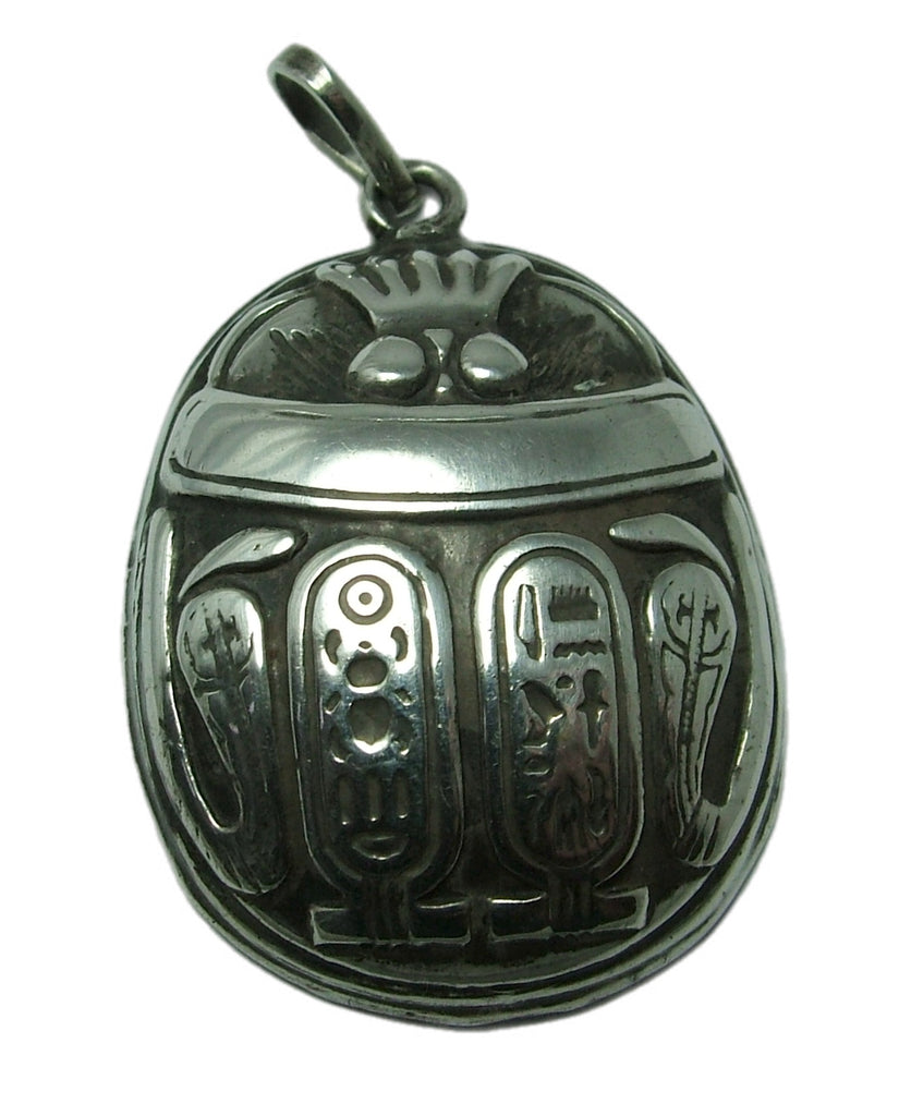 A large vintage 1930's hollow silver charm of a scarab beetle with Egyptian hieroglyphics to the front and back. A lovely unusual piece that is nice quality.