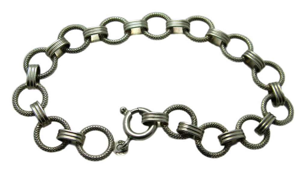 A vintage 1970's silver bracelet with patterned circle links between flattened ribbed links, a very pretty combination.