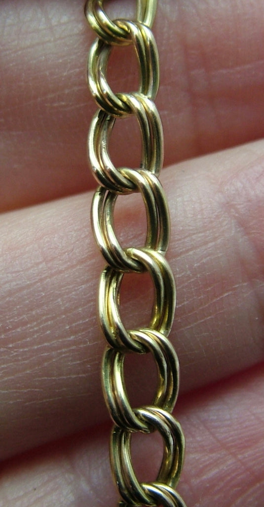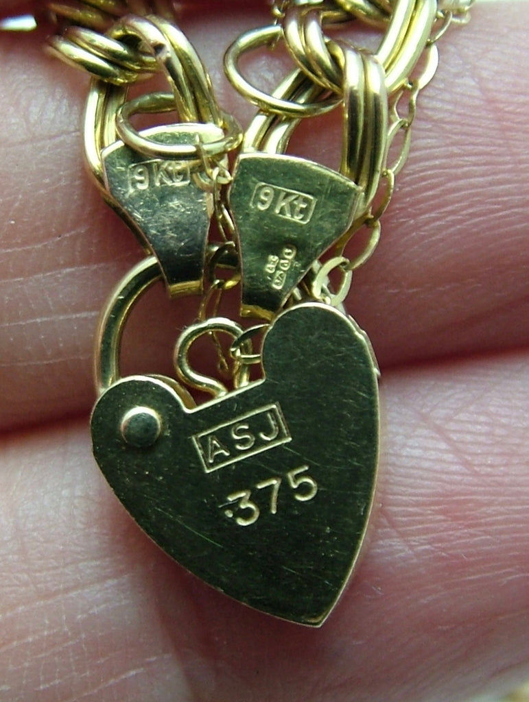 The bracelet has a wearable length of 7.5 inches and a width of 5mm at the widest point. It has a secure padlock fastener and a safety chain. The end links are both marked “9Kt” and one has full Birmingham import marks for 1980. The padlock is marked “375” for 9ct gold. It is all in very good condition and perfect for small charms.