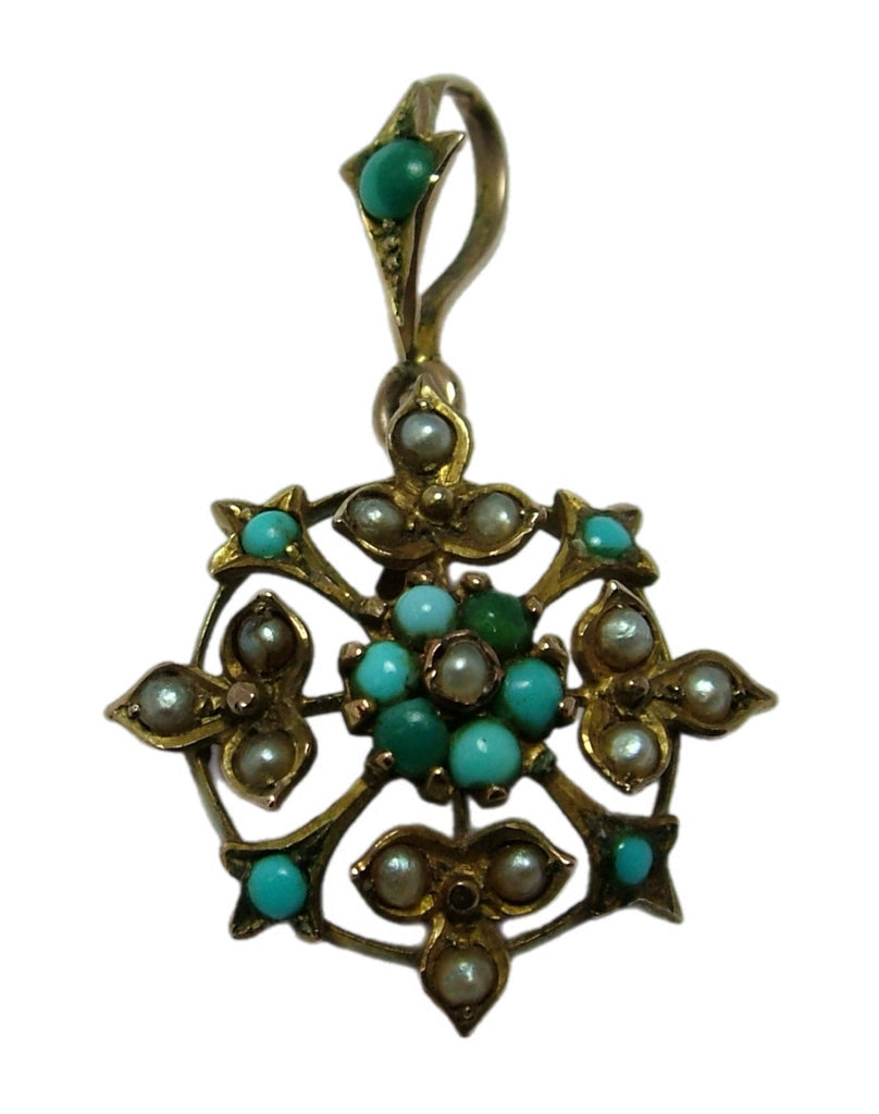 Antique Victorian c1890's 9ct Gold, Seed Pearl & Turquoise Flower Charm or Pendant