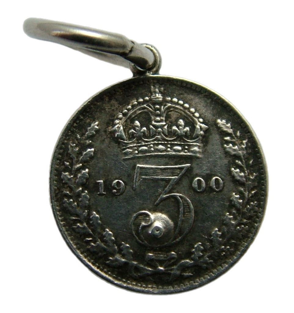 An antique Victorian silver 1900 threepence coin that has been set with an opaline glass cabochon and a loop added for suspension.