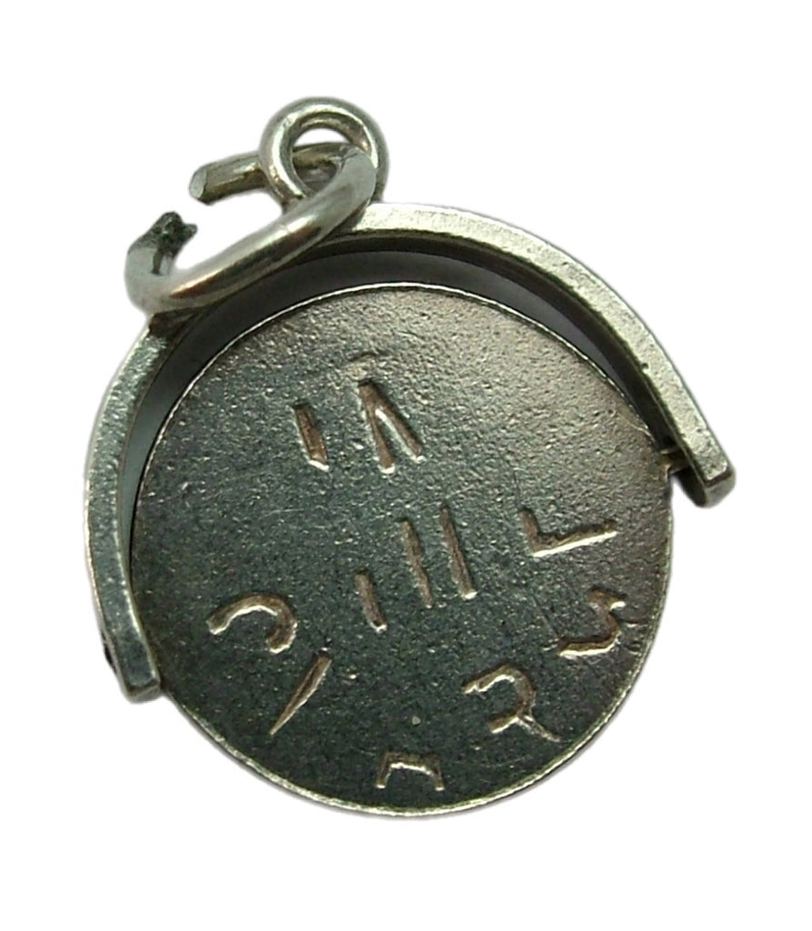 A vintage 1960's silver spinner charm that spells out “I’M IN CHARGE” when spun around quickly.