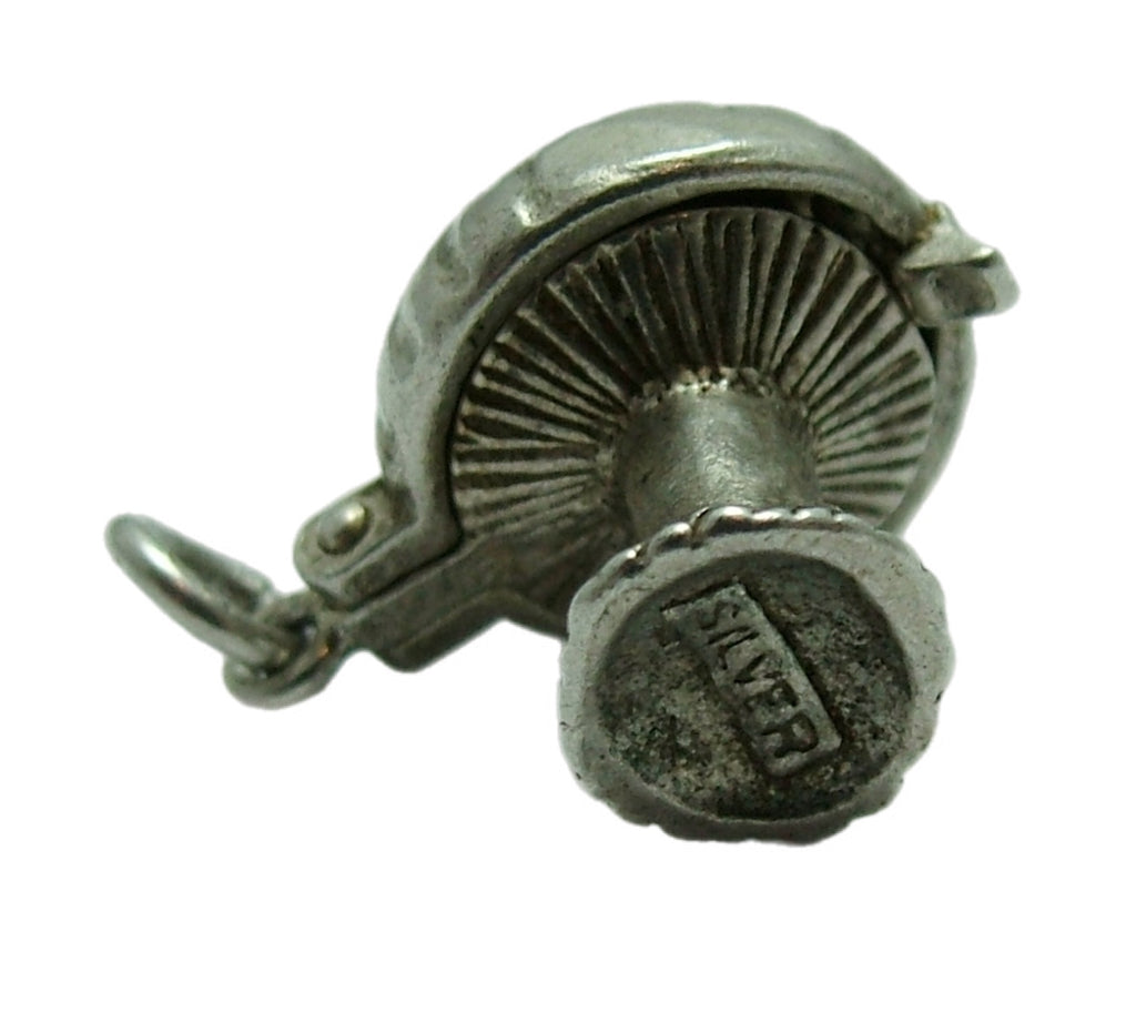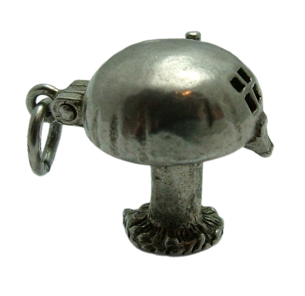 A vintage 1960's English silver charm of a toadstool/mushroom house that opens to reveal a lucky pixie inside.
