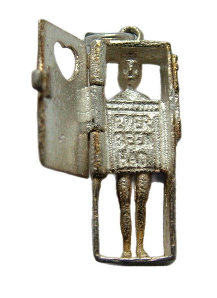 A vintage 1970's English silver charm of a shower cubicle, with what appears to be a naked lady inside, that opens to reveal her modesty covered with a sign saying “EVER BEEN HAD”. A fun piece that is hard to find.