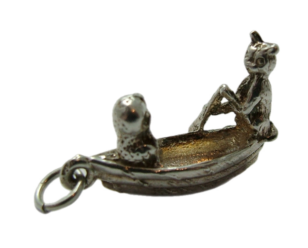 A vintage 1970's English solid silver charm of “the owl and the pussycat” in their boat, from the nursery rhyme of the same name.