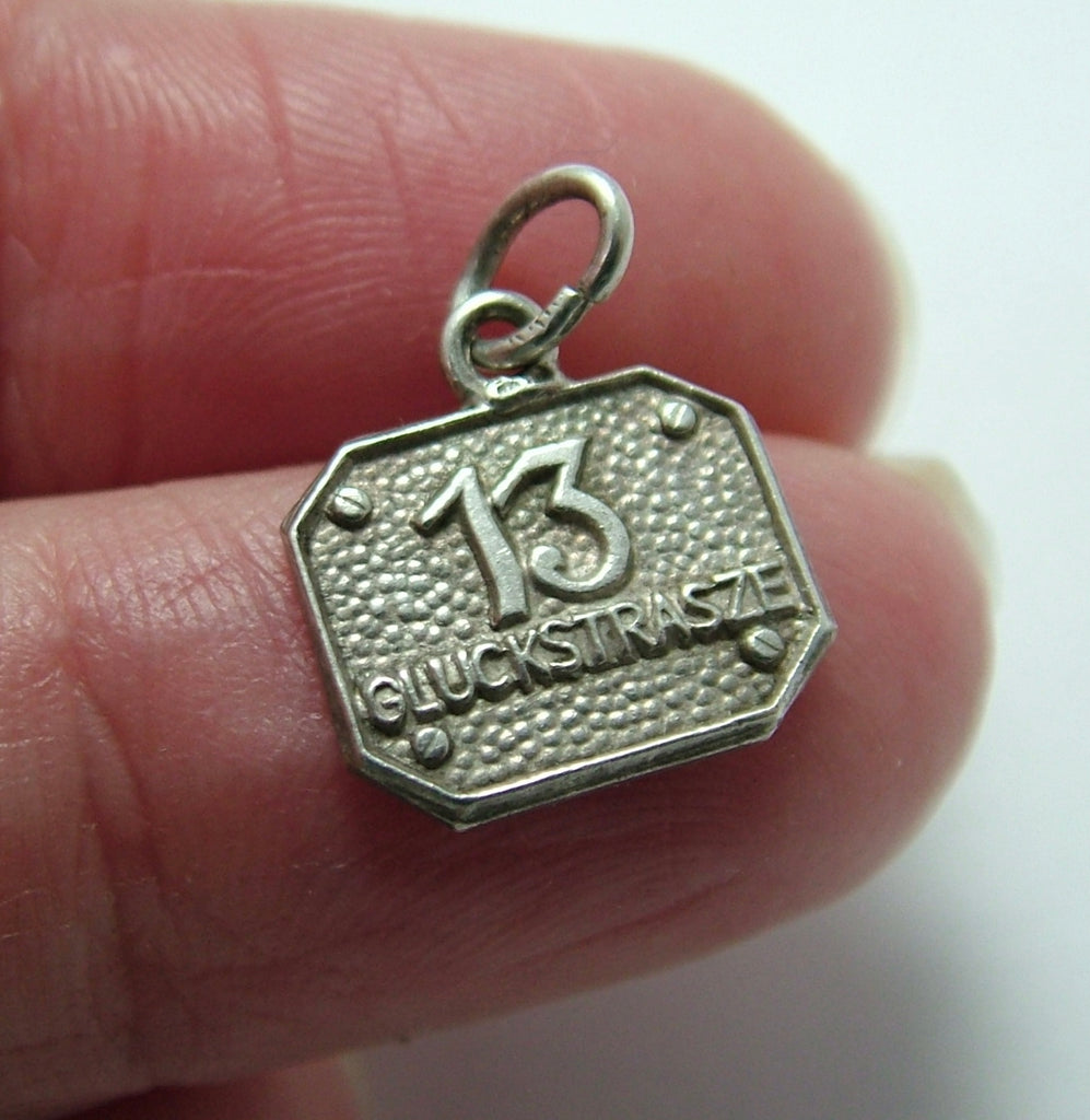A small vintage 1950's European silver lucky No.13 “Gluckstrasze” street sign charm.