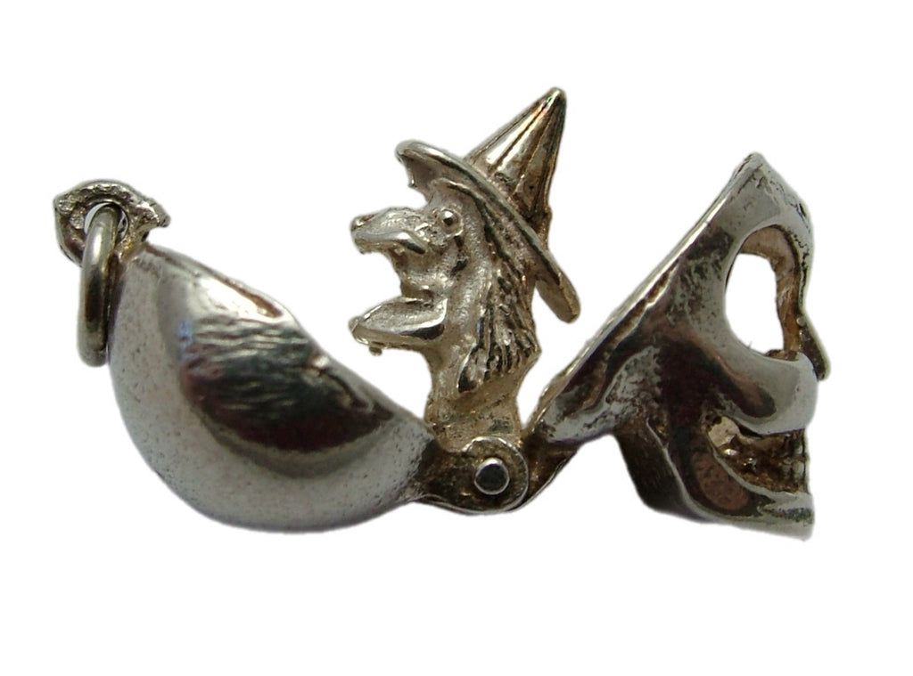 Vintage 1970's Silver Opening Skull Charm with Witch Inside